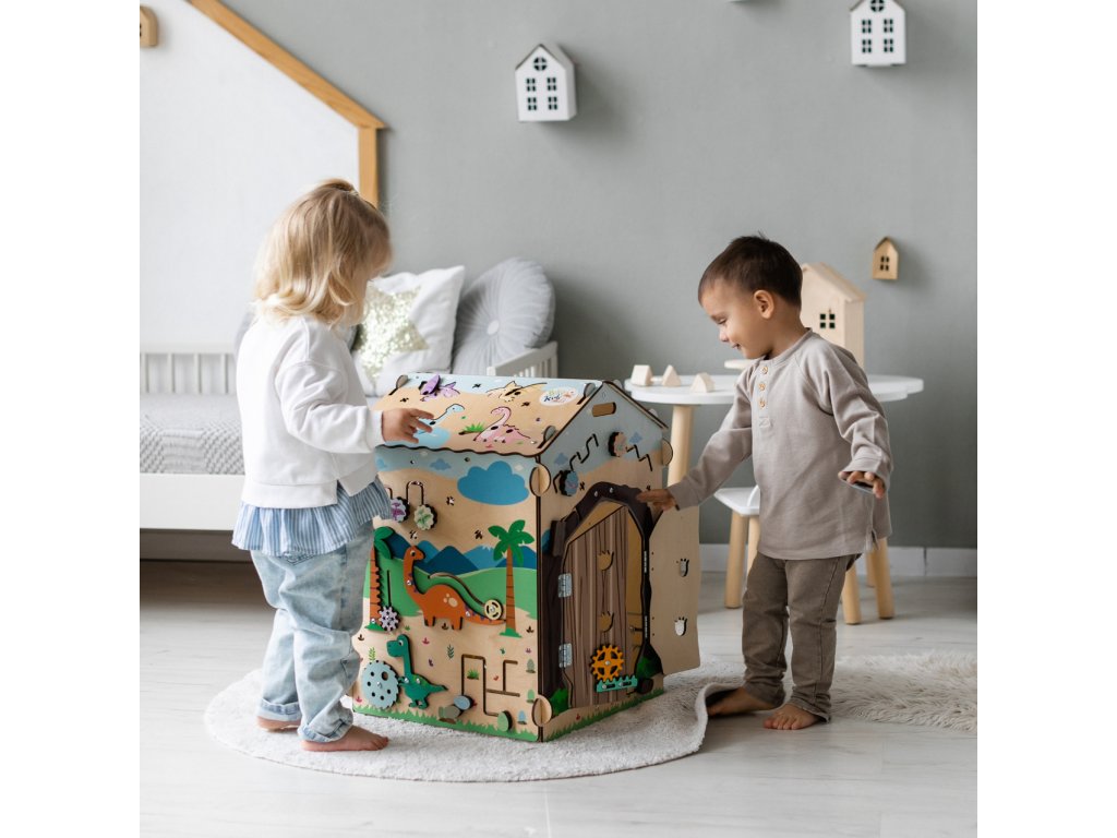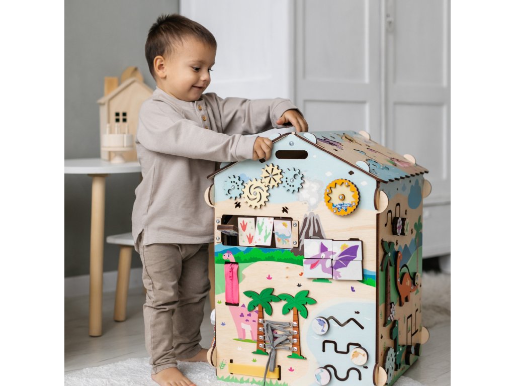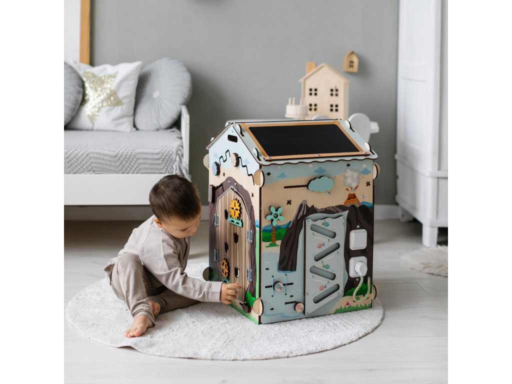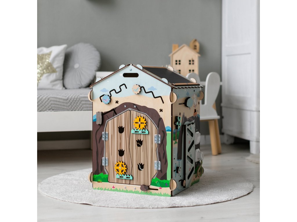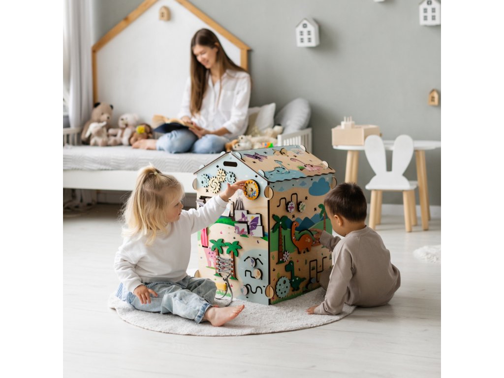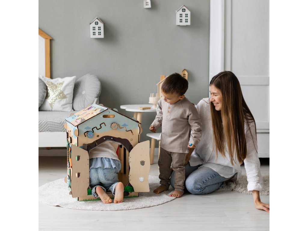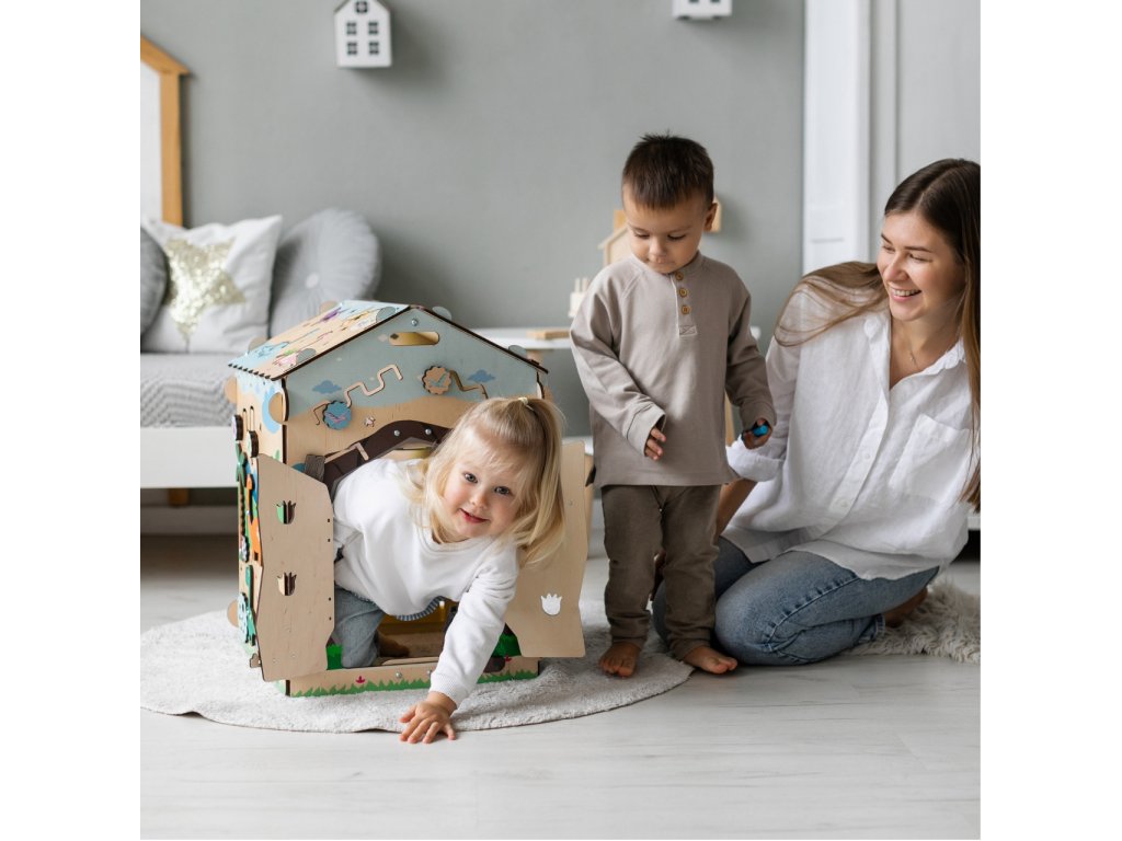 The playhouse develops fine motor skills and logical thinking. It teaches concentration and patience. It fuels children's imagination. Can the busyhouse be used as a doll's room or a car garage? Definitely. For example, it's also a good place to hide with their potty. The children themselves came up with all this while testing the playhouse.