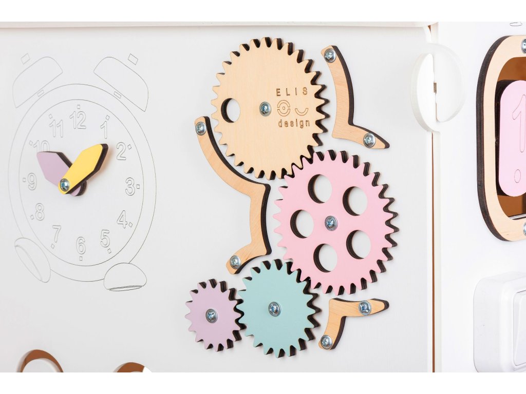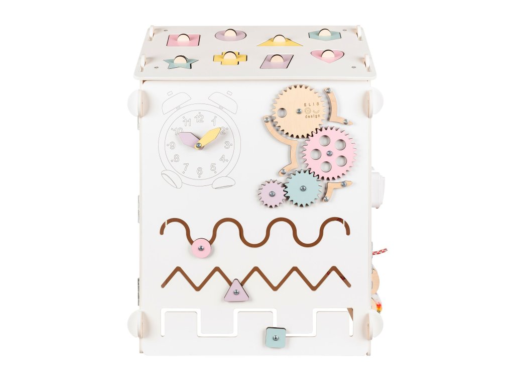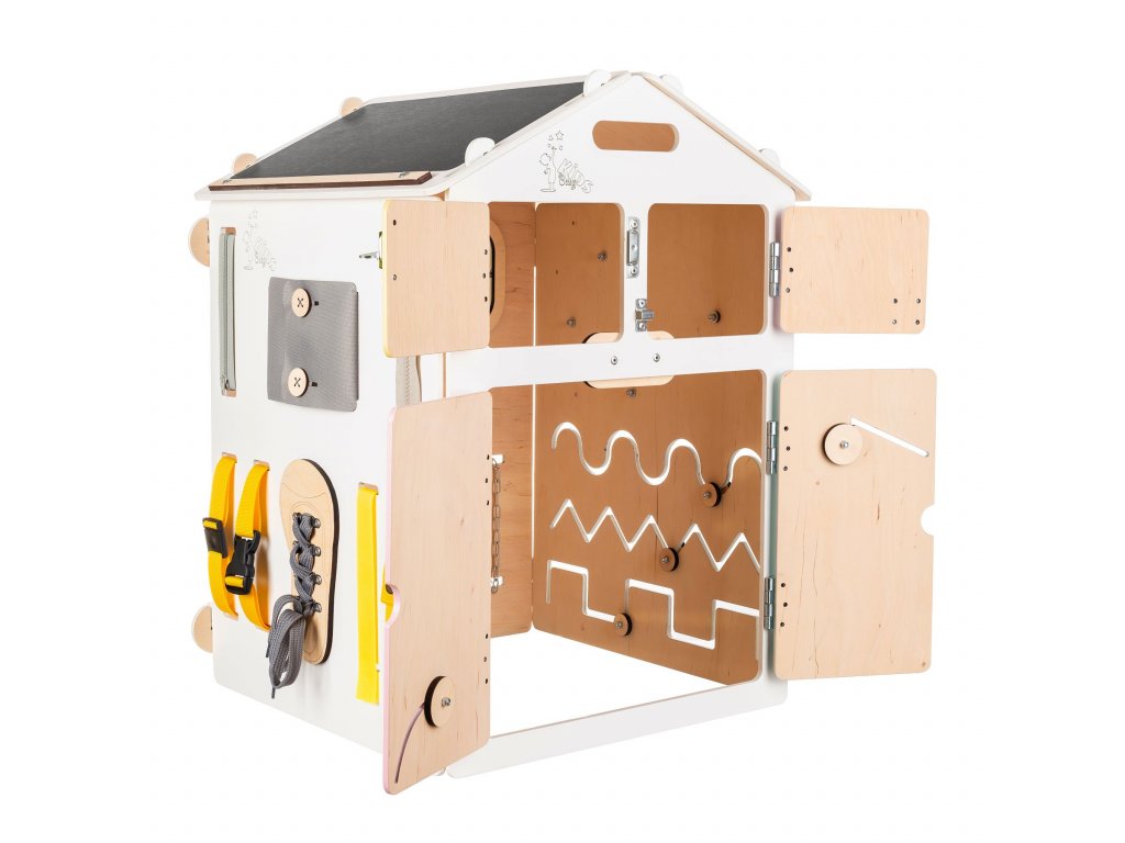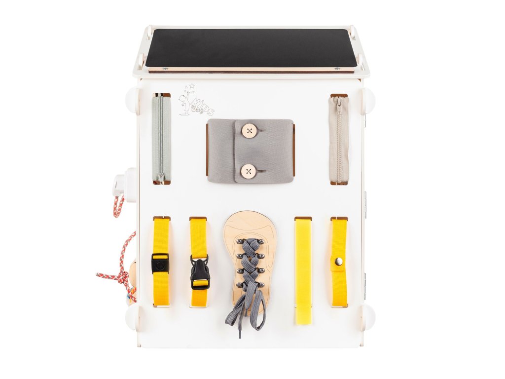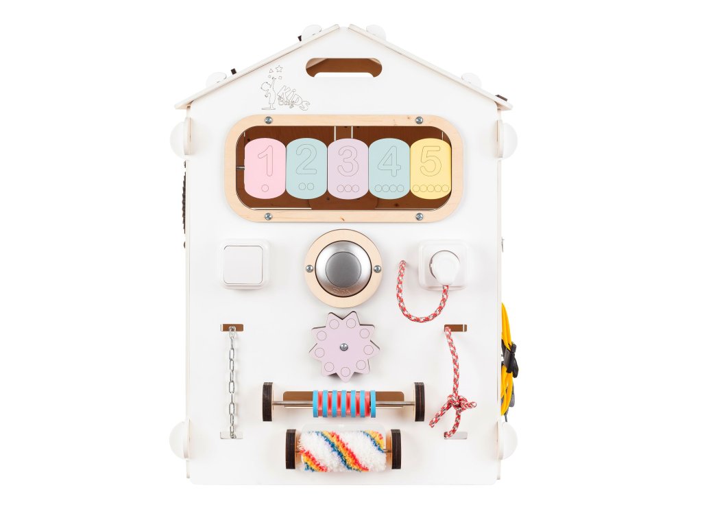 The BusyKids House is an interactive toy that offers about 30 game elements which are focused on developing creativity, sensory skills, and logical thinking. For example, you can find abacus, touch light, alarm clock, motor labyrinth, blackboard or inserts on one of the six activity boards. Our aim was to entertain the children but mainly to prepare them to be independent via unhurried, natural way. And hence we have added elements such as buckles, zippers, buttons, and threading shoe.