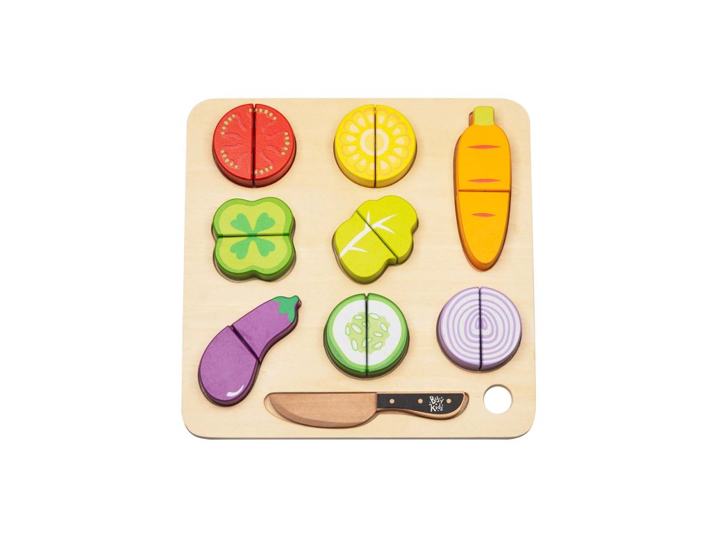 The set includes realistically crafted wooden vegetables that can be split into two parts. The halves of the vegetables are connected with Velcro, allowing the child to easily assemble and disassemble them over and over again. This also helps prevent the loss of pieces.
