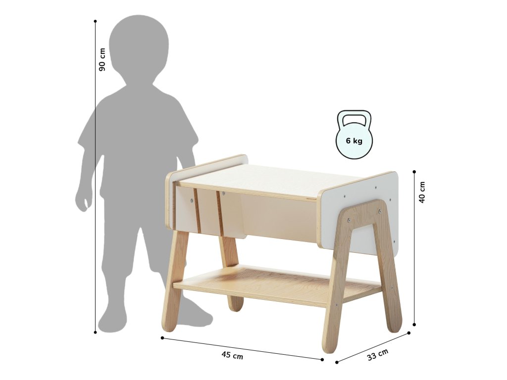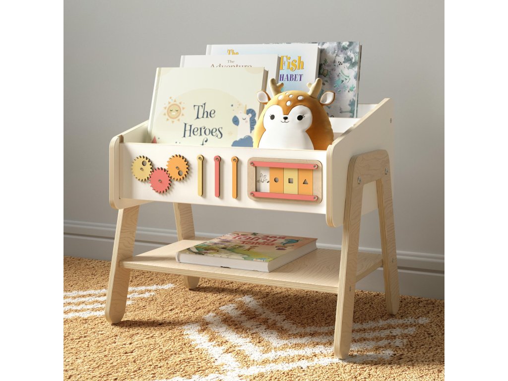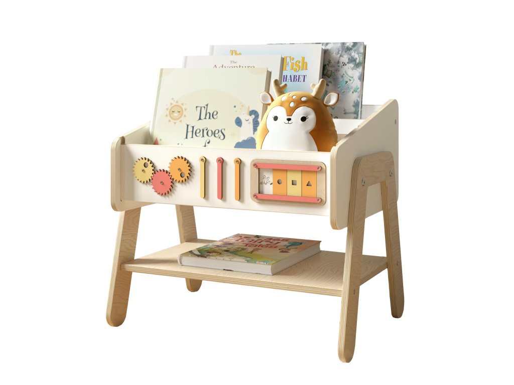 A smart 3-in-1 children’s furniture piece that works as a bookshelf, small chair, and bedside table. The open front-facing shelves encourage reading, while the side busyboard keeps little hands engaged. Made from safe birch plywood, its compact and stable design fits perfectly in modern homes and small spaces. Suitable for children from 1 year old.