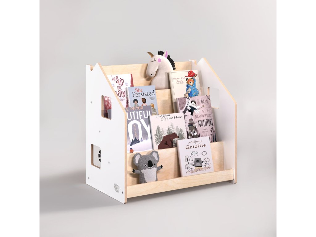 Thanks to its minimalist design, the bookshelf fits almost any interior. The bookshelf consists of 4 shelves and holds a lot of books. There is also space at the back for storage of toys or books. During the production of the Montessori shelf, we paid great attention to safety: it is stable, coated with a water-based varnish and all its corners are rounded.