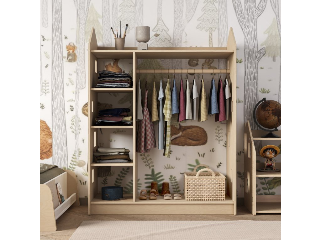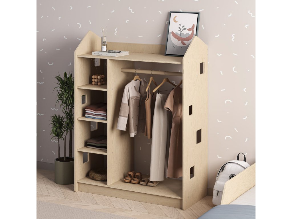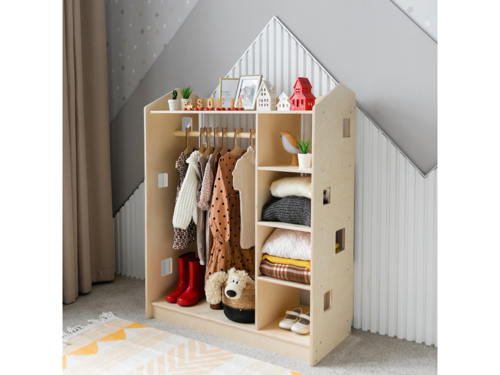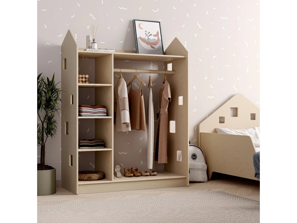 We present you a functional solution for efficient clothing storage — a unique open-type children's wardrobe in the shape of a little house, which complements our existing bestsellers: toy and book shelves from the same collection.