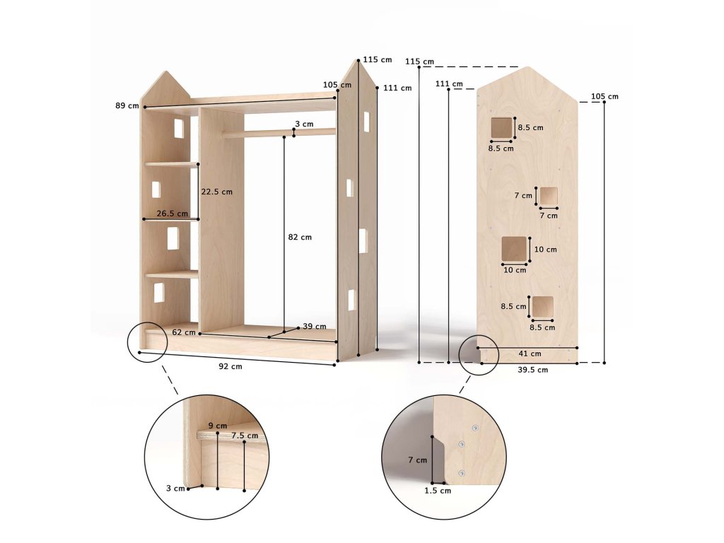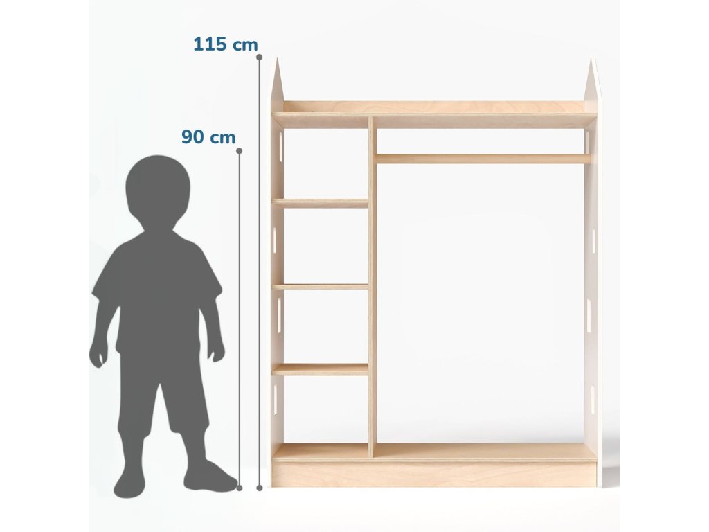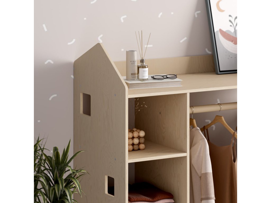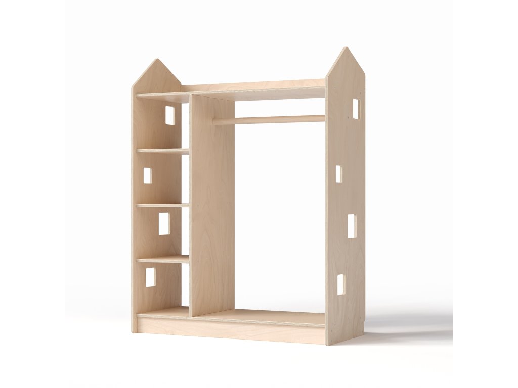 We present you a functional solution for efficient clothing storage — a unique open-type children's wardrobe in the shape of a little house, which complements our existing bestsellers: toy and book shelves from the same collection.