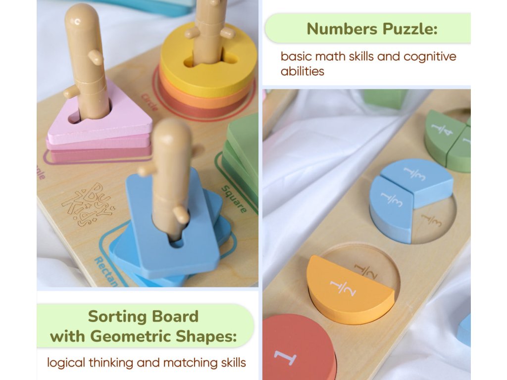 Sorting Board with Geometric Shapes: Develops logical thinking and matching skills. Helps children learn shapes and colors through play, improving hand-eye coordination and fine motor skills.