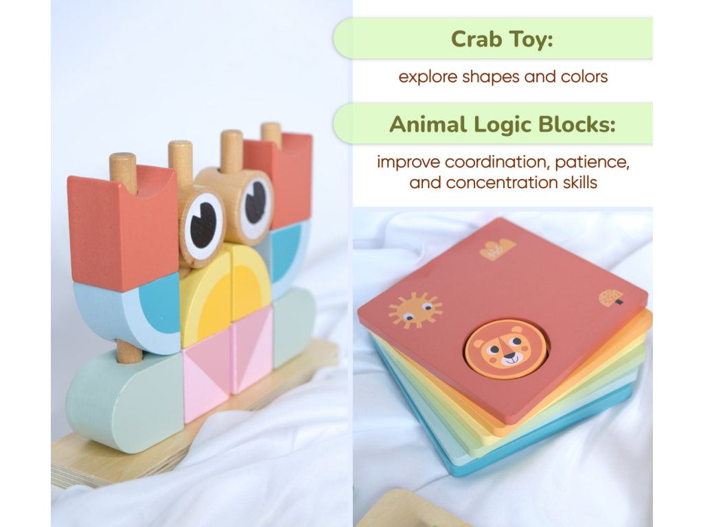 Crab Toy: Designed to enhance motor skills and teach shapes and colors.