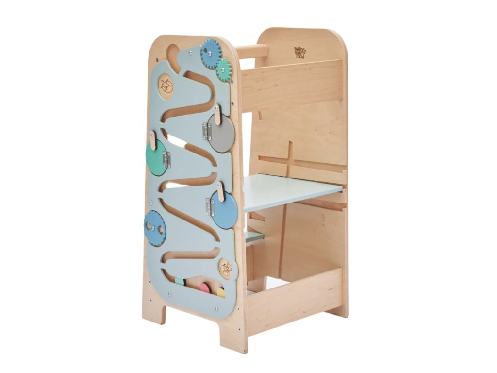 Do you like multifunctional toys? So do we. That's why we made a growing learning tower that has playful elements on the sides and can even be turned into a small table and chair. Thanks to the learning tower, your little one can cook with you, help in the workshop, or even stand at the sink and reach the toothbrush with toothpaste by themself. The learning tower develops independence and teaches, in a natural way, even the smallest ones how to be part of running the household (for example, setting the plates on the table when they’re on the top shelf).