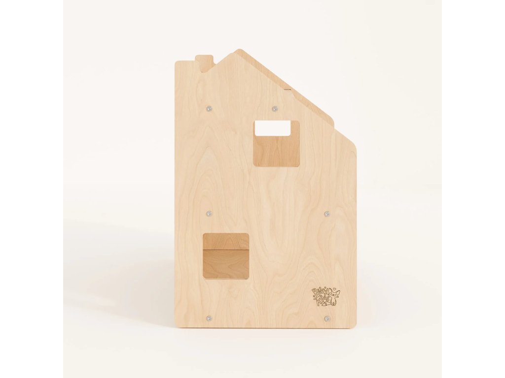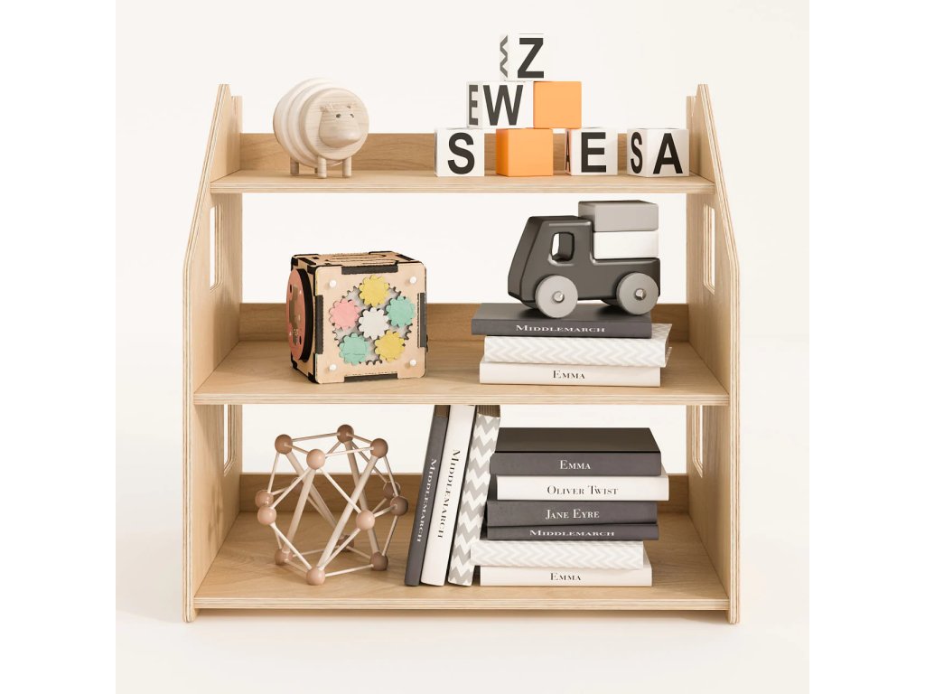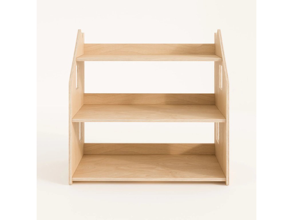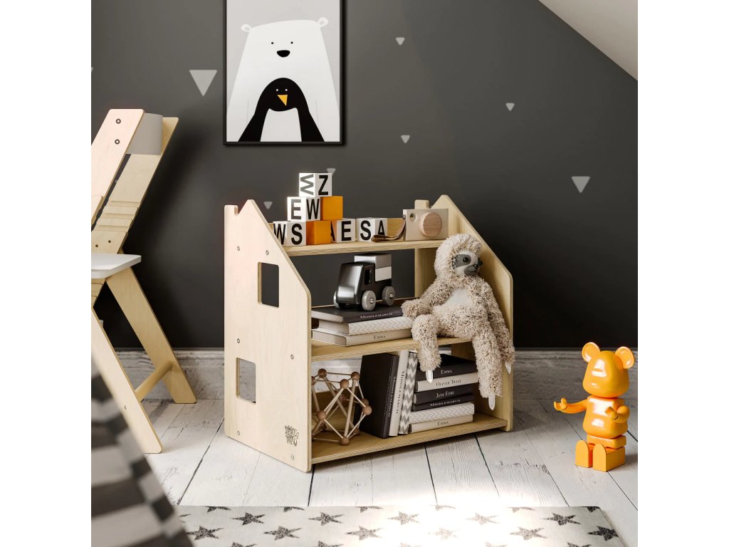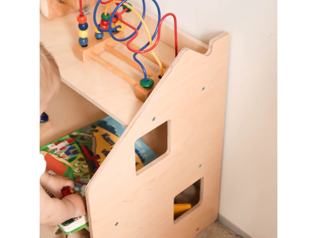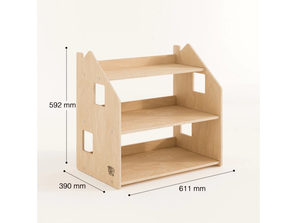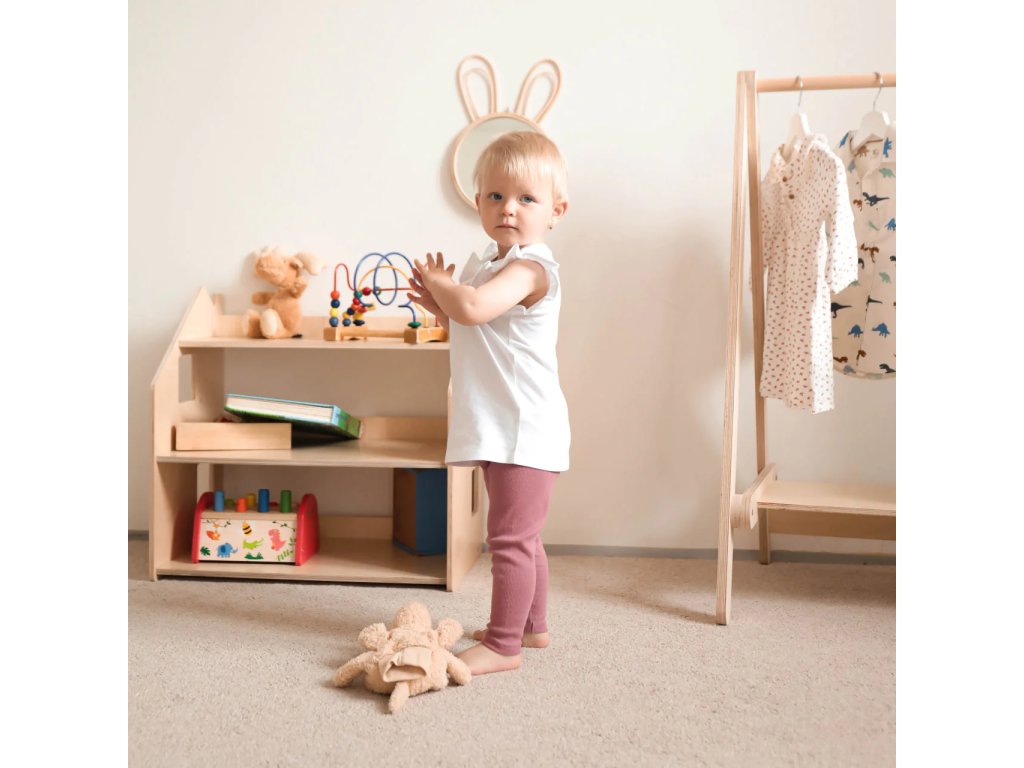 When designing the shelf, we thought about the fact that it should not only be functional, but also aesthetically pleasing and safe. We used high-quality, natural-coloured birch plywood to emphasise the neutrality and naturalness of the product. The shelf is coated with a water-based lacquer. The furniture has no sharp corners and its surface is smooth.